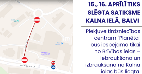 Uzsākot projekta īstenošanu – Balvu pilsētas tranzītielu (Partizānu un Brīvības ielu posmu) asfalta seguma un apakšzemes komunikāciju atjaunošanu – uz remontdarbu laiku, no 15. aprīļa līdz 16. aprīlim, būs slēgta satiksme Kalna ielā. Transportlīdzekļu kustības ātruma ierobežojums 30 km/h visā posmā.