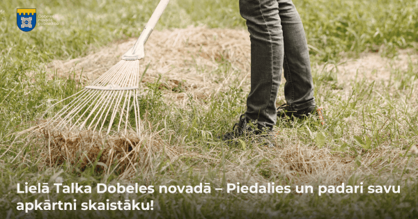 AicinÄm ikvienu piedalÄ«ties LielajÄ TalkÄ Dobeles novadÄ no 19. lÄ«dz 27. aprÄ«lim! Talkas notiks dažÄdÄs vietÄs ā pie skolÄm, parkos, muižu teritorijÄs un dzÄ«vojamo mÄju apkÄrtnÄ.