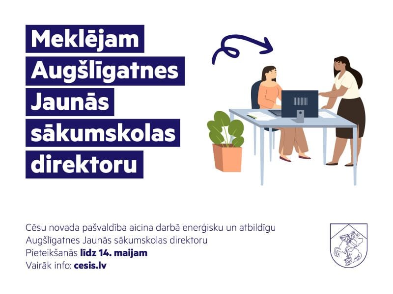 - Pieteikumu (motivācijas vēstuli, CV (pretendenta dzīves un darba gaitu apraksts), prezentāciju) ar norādi “Augšlīgatnes Jaunās sākumskolas direktors” parakstītu ar drošu elektronisko parakstu, iesūtīt līdz 2025. gada 14. maijam uz e-pasta adresi: vakances@cesunovads.lv