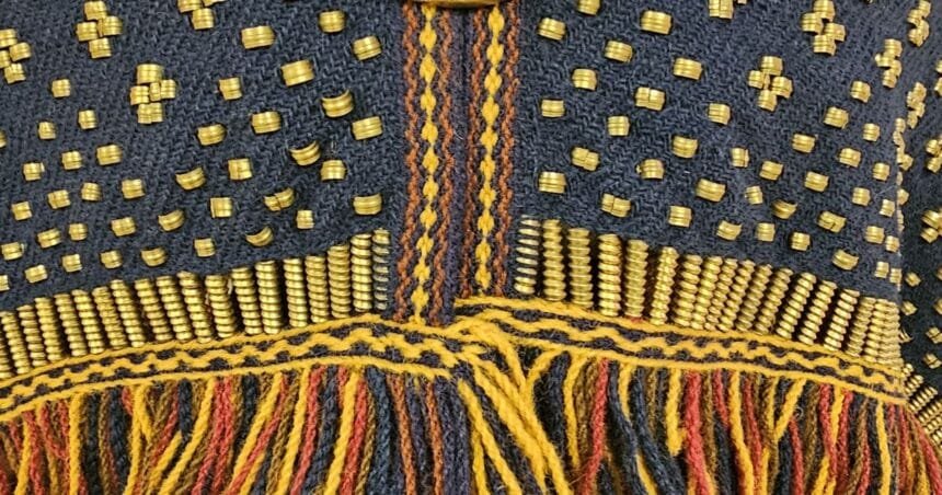 Vēlajā dzelzs laikmetā (9.- 12.gs.) tērpi tika bagātīgi rotāti ar bronzu. Šī iezīme redzama arī eksponētajā tērpā. Villaine bagātīgi rotāta ar ieaustiem bronzas gredzentiņiem, villaines gali rotāti ar spirālēm un kuplinātām bārkstīm.
