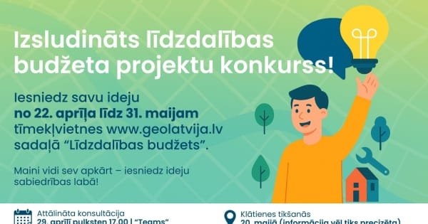 Aizkraukles novada dome izsludinājusi līdzdalības budžeta projektu konkursu. Iedzīvotāji aicināti no 22. aprīļa līdz 31. maijam iesniegt savus projektus elektroniski tīmekļvietnes www.geolatvija.lv sadaļā “Līdzdalības budžets”.