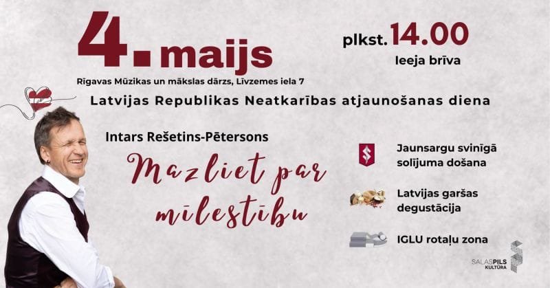 Atzīmējot 4. maiju, plkst. 14.00 ikviens bez maksas varēs baudīt  īpašu koncertuzvedumu “Mazliet par mīlestību”. Tas būs emocionāls un iedvesmojošs Intara Rešetina-Pētersona stāsts par mūsu tautas spēku, vērtībām un cerībām uz gaišu nākotni. Tas būs stāsts par mūsu vērtībām, kas pastāstīts caur iemīļotām dziesmām un interesantiem stāstiem. Tas būs īpašs stāsts par latvieša tautisko kodu, mīlestību un patriotismu. Koncertuzvedums “Mazliet par mīlestību” skar ikvienu no mums – mūsu vērtības, pašcieņu, pašapziņu un cerības par gaišu nākotni mūsu bērniem. Latvijas kultūras mantojuma un identitātes caurvīts, šis uzvedums aizvedīs klausītājus emocionālā ceļojumā, pievēršoties jautājumiem par latviešu tautas spēku, izturību un vienotību.