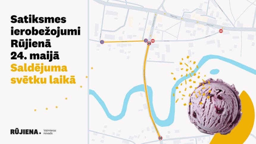 24. maijā svinēsim Saldējuma svētkus Rūjienā, darbosies tirdziņš un citas aktivitātes, tāpēc no plkst. 7.00-16.00 Saldējuma svētkos Rūjienā paredzami sekojoši satiksmes ierobežojumi: