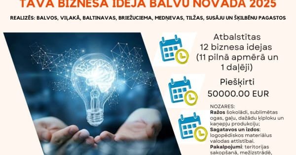 Balvu novada pašvaldības konkursa “Tava biznesa ideja Balvu novadā” 2025.gada vērtēšanas komisija pieņēma lēmumu apstiprināt 12 biznesa idejas (no tām 11 idejas pilnā apjomā un 1 ideju daļēji atbilstoši pieejamajam finansējumam konkursam).