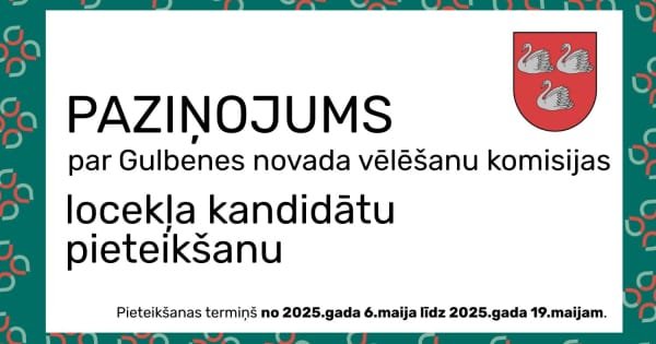 Saskaņā ar Gulbenes novada pašvaldības domes 2025.gada 24.aprīļa lēmumu Nr.GND/2025/320 „Par Gulbenes novada vēlēšanu komisijas locekļa kandidātu pieteikšanas termiņa noteikšanu” (protokols Nr.10, 67.p.) ir noteikts Gulbenes novada vēlēšanu komisijas locekļa kandidātu pieteikšanas termiņš no 2025.gada 6.maija līdz 2025.gada 19.maijam.