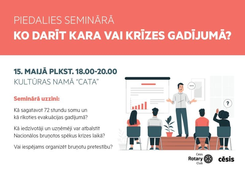 Cēsīs, kultūras namā “CATA” 15. maijā no plkst. 18.00 līdz plkst. 20.00 “Cēsu Rotary klubs” sadarbībā ar Cēsu novada pašvaldību aicina iedzīvotājus uz nozīmīgu informatīvo pasākumu “Ko darīt kara vai krīzes gadījumā?”. Pasākuma mērķis ir sniegt sabiedrībai praktisku un noderīgu informāciju par rīcību ārkārtas situācijās – militāru apdraudējumu, dabas katastrofu vai citu nopietnu krīžu gadījumā.