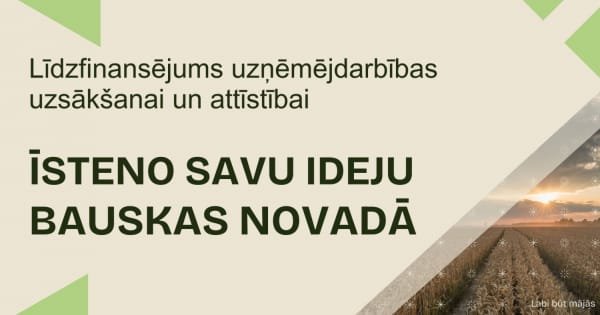 Bauskas novada pašvaldība izsludina pieteikšanos projektu konkursam „Īsteno savu ideju Bauskas novadā!”. Līdzfinansējuma piešķiršanas mērķis ir sniegt atbalstu projektiem, kas tiks realizēti Bauskas novadā, tā veidojot aktīvu ekonomisko vidi, veicinot jaunu produktu un pakalpojumu radīšanu, jaunu darba vietu veidošanos. Līdzfinansējumu piešķir fiziskai vai juridiskai personai jauna uzņēmuma radīšanai un/vai esoša uzņēmuma, kura darbība nepārsniedz trīs gadus, attīstībai.