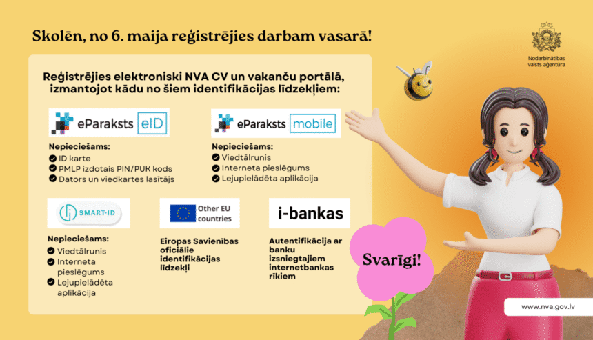 Pieteikties vasaras darbam skolēni varēs, autentificējoties NVA CV un vakanču portālā, izmantojot kādu no šiem identifikācijas līdzekļiem: