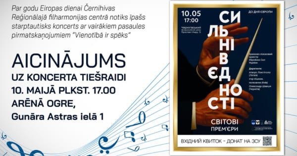 Par godu Eiropas dienai, 10. maijā plkst. 17.00 Černihivas Reģionālajā filharmonijas centrā notiks īpašs starptautisks kultūras notikums — sestdienas vakara koncerts ar vairākiem pasaules pirmatskaņojumiem “Vienotībā ir spēks”.