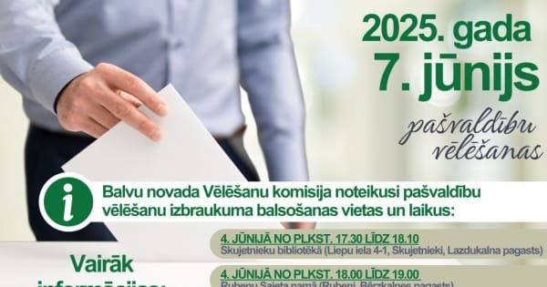 - Rubeņos, Bērzkalnes pagastā, Balvu novadā (izbraukuma balsošana notiks Rubeņu Saieta namā – Rubeņi, Bērzkalnes pagasts, Balvu nov., LV-4590) – trešdien, 2025. gada 4. jūnijā, no plkst.18.00 līdz 19.00;