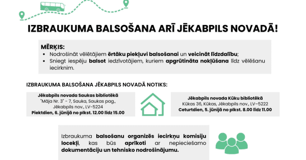 Jēkabpils novada vēlēšanu komisija informē, ka, pamatojoties uz Centrālās vēlēšanu komisijas apstiprināto Instrukciju Nr. 10, Jēkabpils novadā būs iespēja izmantot izbraukuma balsošanu.