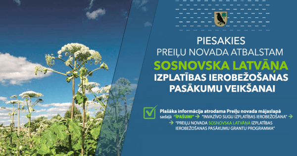 Preiļu novada pašvaldība līdz 2025. gada 15. jūnijam aicina pieteikties izsludinātajam grantu pieteikumu konkursam “Preiļu novada Sosnovska latvāņa izplatības ierobežošanas pasākumu grantu programma”. Var pieteikties privāto tiesību fiziskas vai juridiskas personas, kuru zemes īpašumi atrodas Preiļu novada teritorijā, un uz kuru zemes īpašuma ir fiksēta latvāņu izplatība vismaz 0,1 ha platībā vai ir fiksēta latvāņa audze ar vismaz 20 augu kopām, un īpašniekam nav nekustamā īpašuma nodokļa parāds par tā īpašumā esošo nekustamo īpašumu, kas atrodas Preiļu novadā. Atgādinām, ka granta programmas ietvaros paredzētais līdzfinansējuma apjoms ir līdz 250 EUR uz 1 ha zemes platības. Zemju īpašniekiem, kuri granta programmas ietvaros 2024. gadā ir noslēguši līgumus, atbalsta pasākumi turpinās arī 2025. gadā atbilstoši šo līgumu noteikumiem.