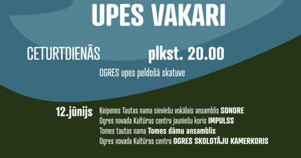 12. jūnijā koncertciklu UPES VAKARI ieskandinās Ķeipenes Tautas nama sieviešu vokālais ansamblis SONORE, Ogres novada Kultūras centra jauniešu koris IMPULSS un OGRES SKOLOTĀJU KAMERKORIS, kā arī Tomes Tautas nama Tomes dāmu ansamblis.