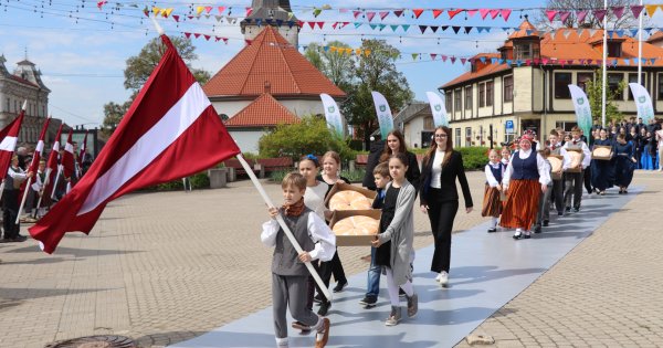 Brīvības laukumā pulcējās Tukuma novada skolu kolektīvi, kuri savas izrotātās pērles nodeva Svētku vēstnesim – virsdiriģentam un Svētku Noslēguma koncerta “TE-AUST” mākslinieciskajam vadītājam Edgaram Vītolam.