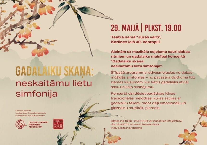 29. maijā plkst. 19.00 teātra namā “Jūras vārti”, Ventspilī, izskanēs īpašs koncerts “Gadalaiku skaņa: neskaitāmu lietu simfonija”, kurš tapis iedvesmojoties no senās ķīniešu kultūras pērles – 24 sezonām. Veicinot mieru un cilvēces attīstību, tas izskan kā aicinājums veidot kopienu ar kopīgu nākotni.