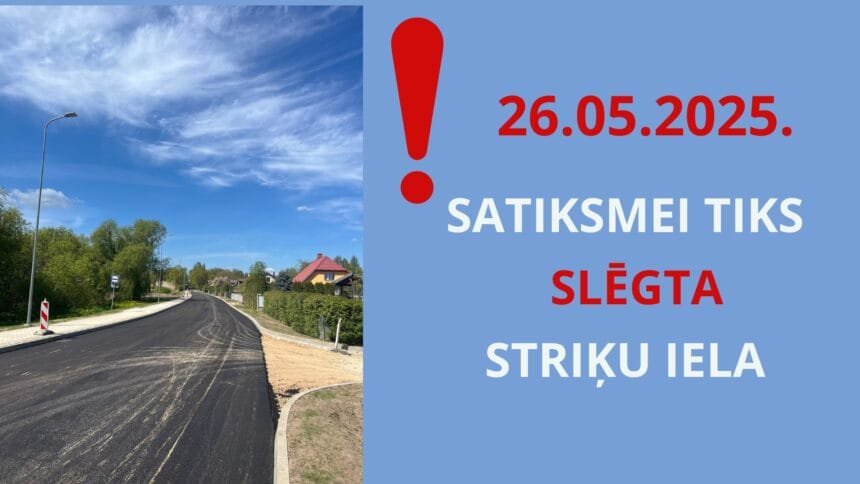 SIA SC GRUPA informē, ka pirmdien, 26.maijā, plkst. 7.00 TIKS SLĒGTA Striķu iela, sākot no Ganību ielas (t.sk. krustojums) līdz pilsētas robežai (Līkā iela) asfalta dilumkārtas izbūvei visā ielas platumā.