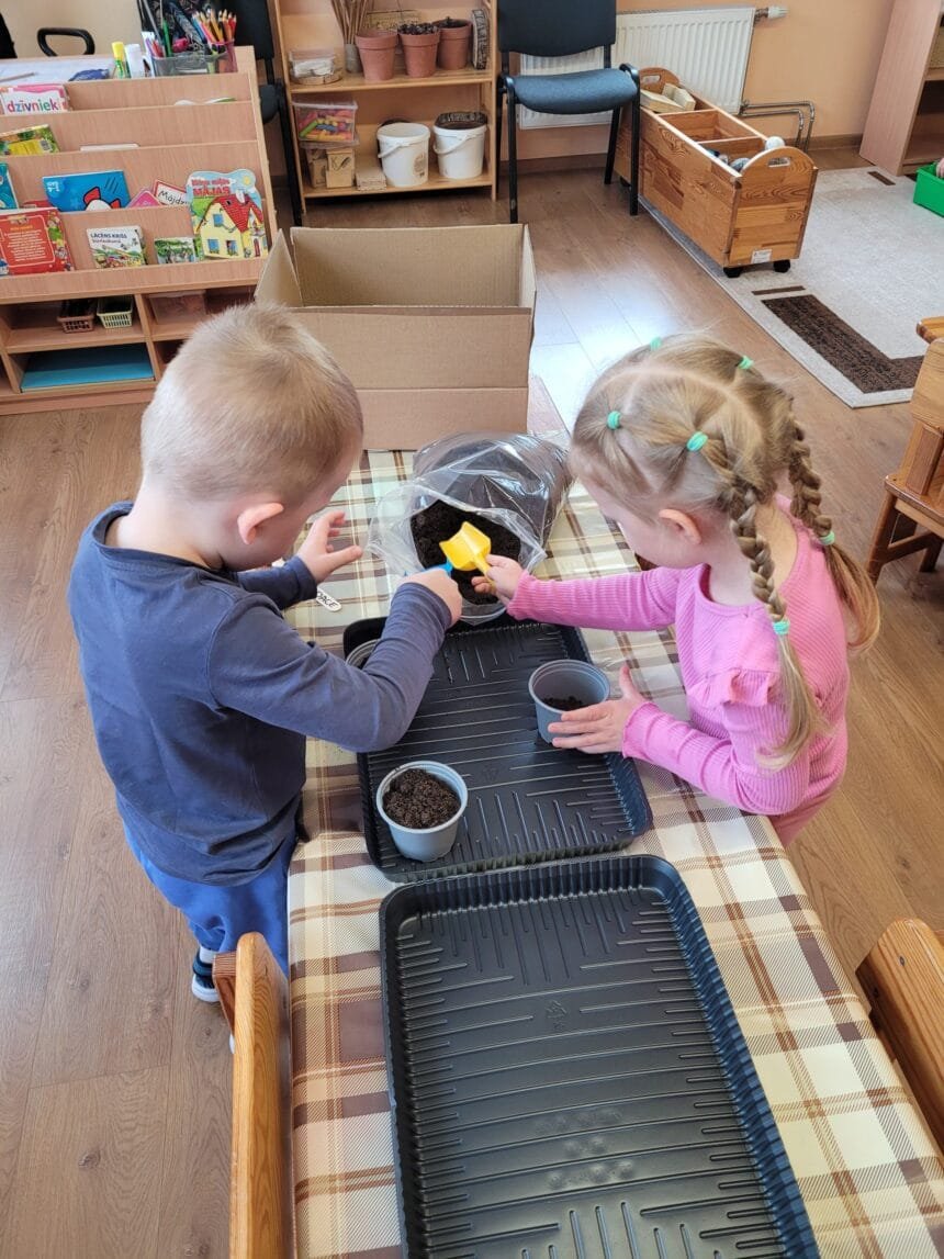 Tika saņemta kaste ar podiņiem, zemi, sēklām, lai katrs bērns spētu iestādīt un skatīties, kā izaug tieši viņa iestādītā sēkliņa. Šajā procesā ikviens grupas bērns izrādīja iniciatīvu un spēju būt atbildīgam par savu iestādīto sēkliņu – to laistot, vērojot kā izlien zaļais asniņš un turpināt par to rūpēties arī tad, kad maija beigās bērni dosies vasaras brīvlaikā, paņemot podiņu līdz uz mājām.