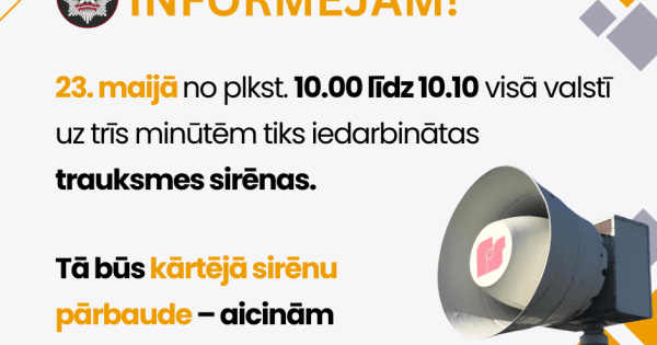 Šī gada 23. maijā no pulksten 10.00 līdz pulksten 10.10 visā valstī uz trīs minūtēm tiks iedarbinātas trauksmes sirēnas, lai pārbaudītu valsts agrīnās brīdināšanas sistēmas ieslēgšanas kārtību un tās darbību, kā arī, lai konstatētu bojājumus vai traucējumus trauksmes sirēnu darbībā un to skaņas signāla dzirdamībā.