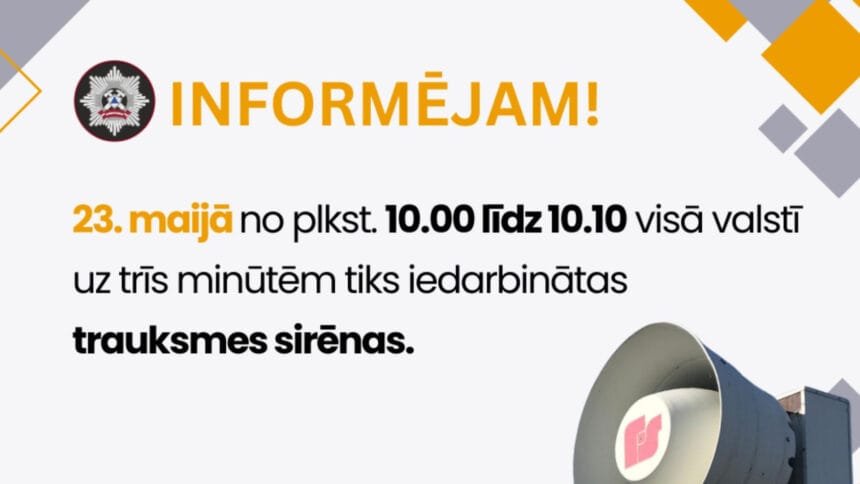 Šī gada 23. maijā no plkst. 10.00 līdz plkst. 10.10 visā valstī uz trīs minūtēm tiks iedarbinātas trauksmes sirēnas, lai pārbaudītu valsts agrīnās brīdināšanas sistēmas ieslēgšanas kārtību un tās darbību, kā arī, lai konstatētu bojājumus vai traucējumus trauksmes sirēnu darbībā un to skaņas signāla dzirdamībā. Trauksmes sirēnu pārbaudes laikā 3 minūšu ilgumā skanēs viļņveida signāls, kas nozīmē, ka skaņas signāls skanēs 5 sekundes, tam sekos pārtraukums, un turpināsies atkārtots 5 sekunžu skaņas signāls un pārtraukums.