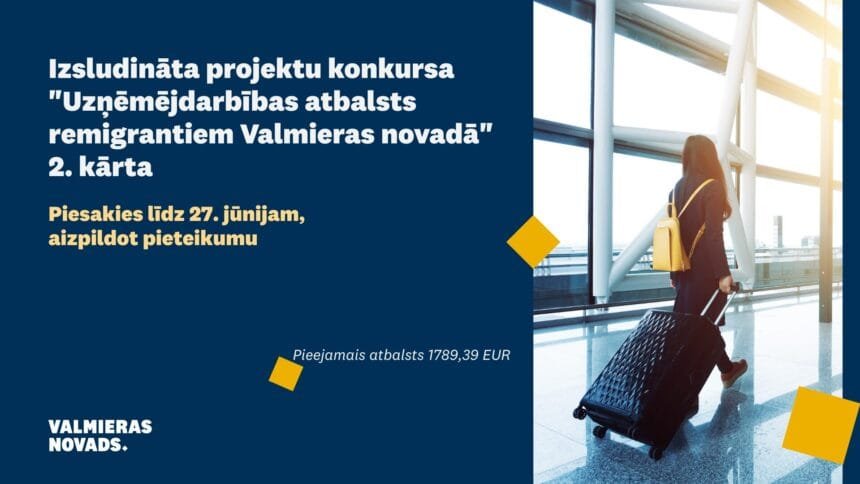 Valmieras novada pašvaldība izsludina projektu konkursa “Uzņēmējdarbības atbalsts remigrantiem Valmieras novadā” 2. kārtu. Aicinām potenciālos atbalsta saņēmējus aizpildīt pieteikumu līdz 27. jūnijam.
