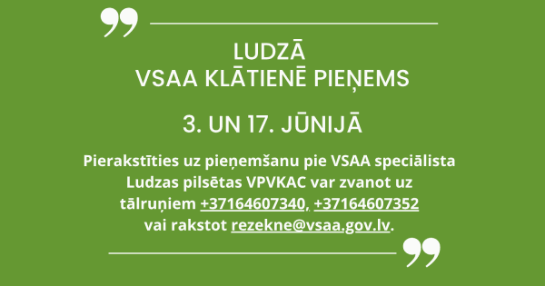 2025. gada jūnija mēnesī VSAA speciālists Ludzas pilsētas VPVKAC telpās pieņems klientus pēc iepriekšēja pieraksta divas reizes mēnesī – 3. un 17. jūnijā.