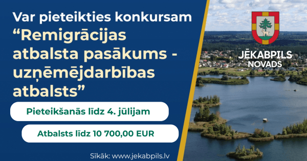 Lai veicinātu iedzīvotāju vēlmi atgriezties Latvijā, Jēkabpils novada pašvaldība sadarbība ar Zemgales plānošanas reģionu un Vides aizsardzības un reģionālās attīstības ministrijas atbalstu organizē konkursu „Remigrācijas atbalsta pasākums – uzņēmējdarbības atbalsts”. Projektu pieteikumus atbalsta saņemšanai var iesniegt no 2025. gada 30. maija līdz 2025. gada 04. jūlijam plkst. 17:00.
