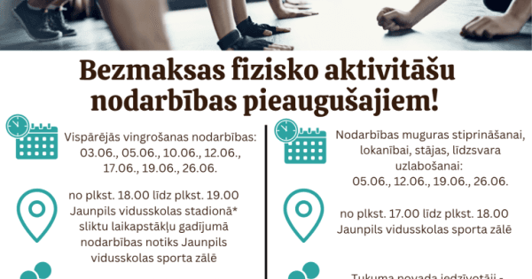 Tukuma novada pašvaldība sadarbībā ar SIA “OnPlate pasākumi” īsteno BEZMAKSAS fizisko aktivitāšu nodarbības ar mērķi nodrošināt fizisko aktivitāšu pieejamību Tukuma novada iedzīvotājiem, lai uzlabotu fizisko veselību, stāju, nostiprinātu muskulatūru, attīstītu līdzsvaru un uzlabotu izturību visiem Tukuma novada iedzīvotājiem!