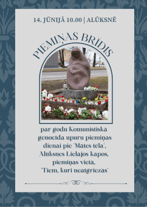 14. jūnijā, pieminot Komunistiskā genocīda terora upurus, pulksten 10.00 pie Mātes tēla Alūksnē notiks piemiņas brīdis, bet pulksten 10.40 atceres mirklis būs arī Alūksnes Lielajos kapos piemiņas vietā “Tiem, kuri neatgriezās”. Sakarā ar šo pasākumu pilsētā būs satiksmes ierobežojumi.