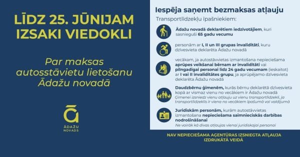 Sabiedrībai viedokļa paušanai nodots saistošo noteikumu projekts “Par Ādažu novada pašvaldības maksas autostāvvietu lietošanu”. Viedokli un priekšlikumus par saistošo noteikumu projektu var izteikt no 11. līdz 26. jūnijam, iesūtot e-pastā dome@adazunovads.lv.