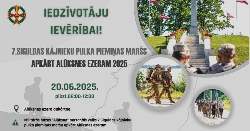 Piektdien, 20.jūnijā, norisināsies tradicionālais maršs apkārt Alūksnes ezeram par godu 7. Siguldas kājnieku pulka gadadienai. Plānots, ka pasākumā piedalīsies aptuveni 100 karavīri un civilie darbinieki no dažādām Mācību vadības pavēlniecības un militārās bāzes “Alūksne” izvietotajām vienībām.
