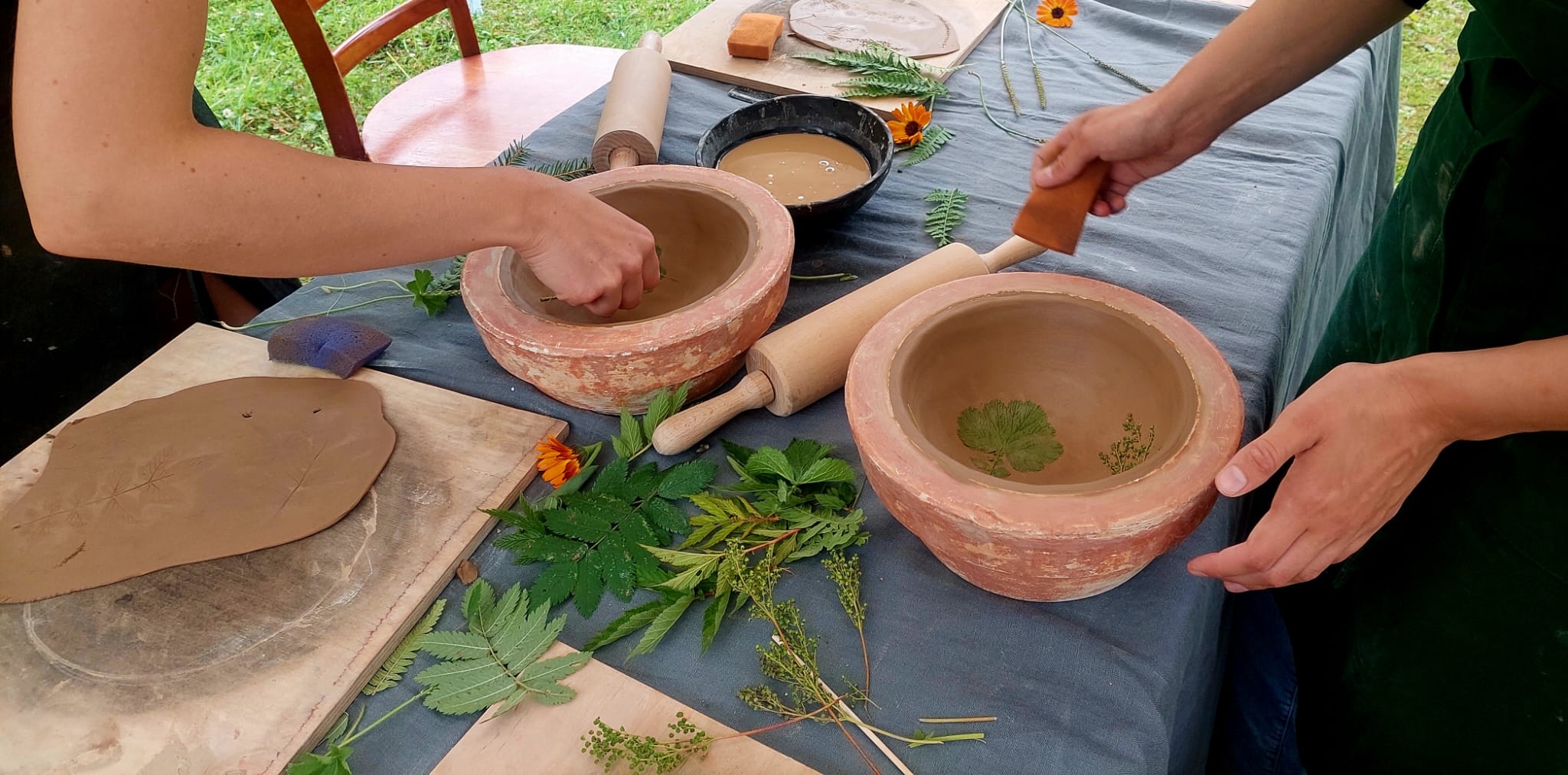 - 9. jūlijā – Augu nospiedumi mālā | Zane Melnace. Mīcot mālu un izmantojot ziedu, lapu un stiebru formas, iespēja veidot trauku ar dabas nospiedumiem. Dalības maksa: 35 EUR. Trauks tiks izsniegts pēc apdedzināšanas (laiku precizēsim nodarbībā);