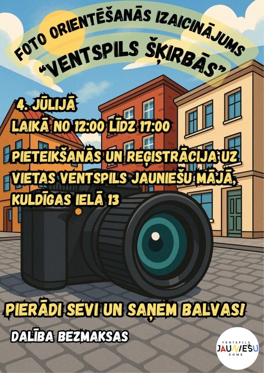Ventspils Jauniešu dome aicina piektdien, 4. jūlijā, piedalīties pilsētas fotoorientēšanās sacensībās “Ventspils Šķirbas”. Starts paredzēts plkst. 12.00 pie Ventspils Jauniešu mājas, Kuldīgas ielā 13, un aktivitātes norisināsies Ventspils vecpilsētas un promenādes teritorijā.