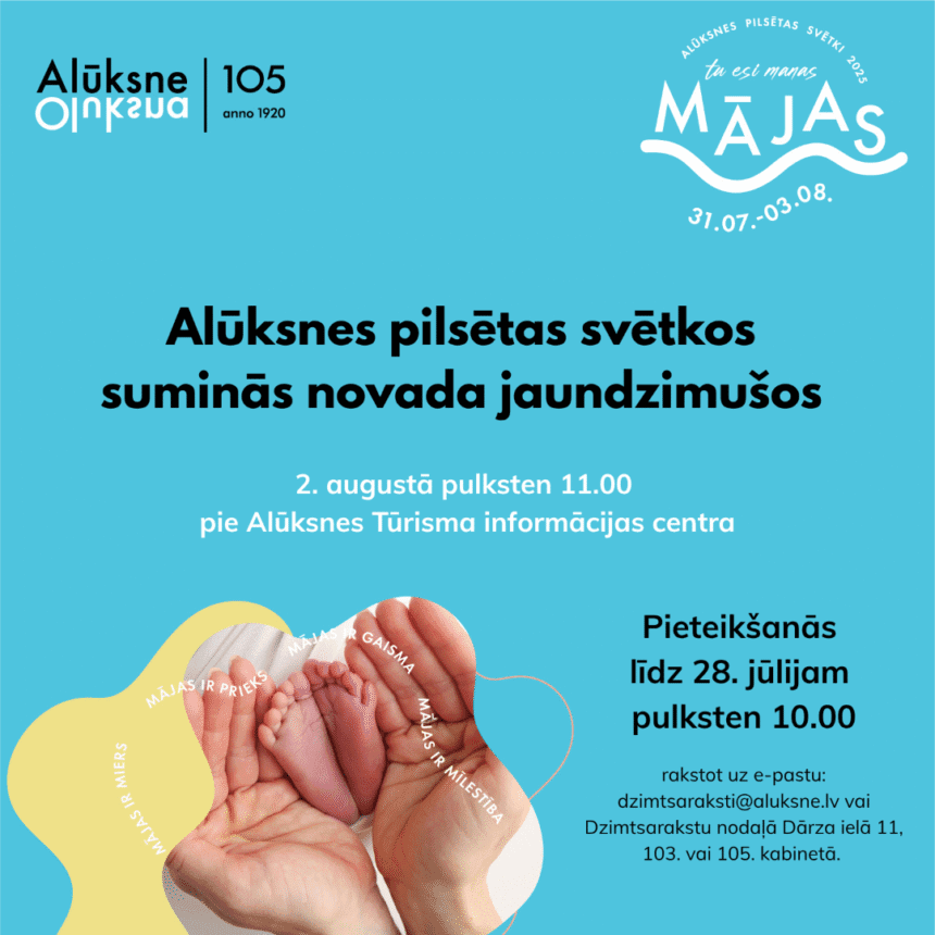 Līdz 28. jūlija pulksten 10.00 Alūksnes novada ģimenes, kurās kopš aizvadītajiem Alūksnes pilsētas svētkiem piedzimis mazulis, aicinātas pieteikties jaundzimušo sumināšanas pasākumam, kas notiks svētku laikā 2. augustā pulksten 11.00 pie Alūksnes Tūrisma informācijas centra.