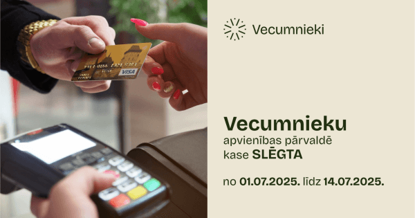 Neatliekamos norēķinus šajā laika posmā var veikt internetbankā vai izmantot tuvākās kases Vecumnieku apvienībā.