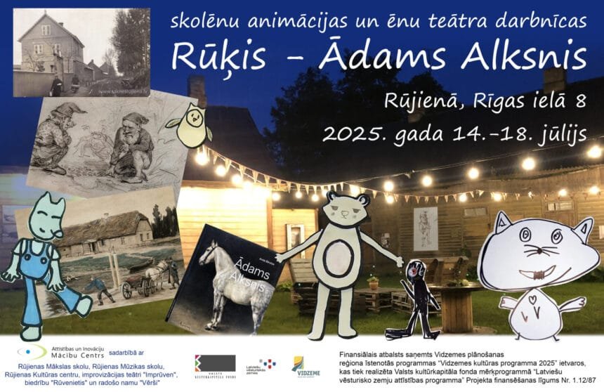 Biedrība “Attīstības un inovāciju mācību centrs” sadarbībā ar filmu animatori Daci Liepu un Rūjienas Mākslas skolu, Rūjienas Mūzikas skolu, Rūjienas Kultūras centru, improvizācijas teātri “Imprūven”, biedrību “Rūvenietis” un radošo namu “Vērši” aicina skolēnus piedalīties radošajās darbnīcās, lai kopīgi izveidotu animācijas filmu un iepazītu Rūjienas mākslinieka Ādama Alkšņa daiļradi! Iespēja iesaistīties gan tiem, kam patīk rakstīt un zīmēt, gan tiem, kurus interesē animācija, mūzika vai ēnu teātris. 14. un 15. jūlijā darbnīcās aicināti piedalīties arī bērnu vecāki un vecvecāki.