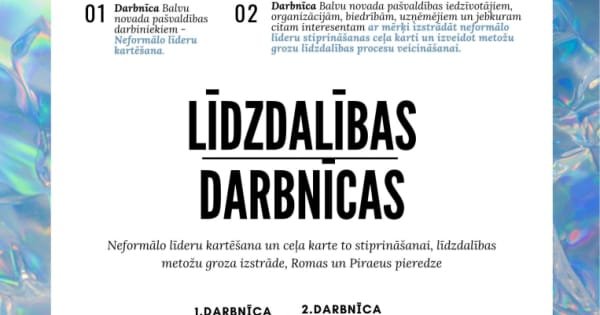 Esi aicināts piedalīties darbnīcās par līdzdalības procesiem un to aktivizēšanu, 09.07.2025. Balvu muižas zālē, lai kopā apzinātu novada neformālos līderus, izstrādātu ceļa karti neformālo līderu stiprināšanai un metožu grozu, ko izmantot, līdzdalības procesu veicināšanai Balvu novadā! Darbnīcās piedalīsies pārstāvji no Romas (Itālija) un Piraeus (Grieķija), lai dalītos savā pieredzē par līdzdalības procesiem!