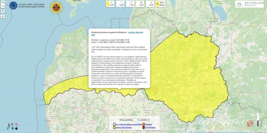 Brīdinājums ir spēkā no 15. jūlija pulksten 13 līdz pulksten 21.