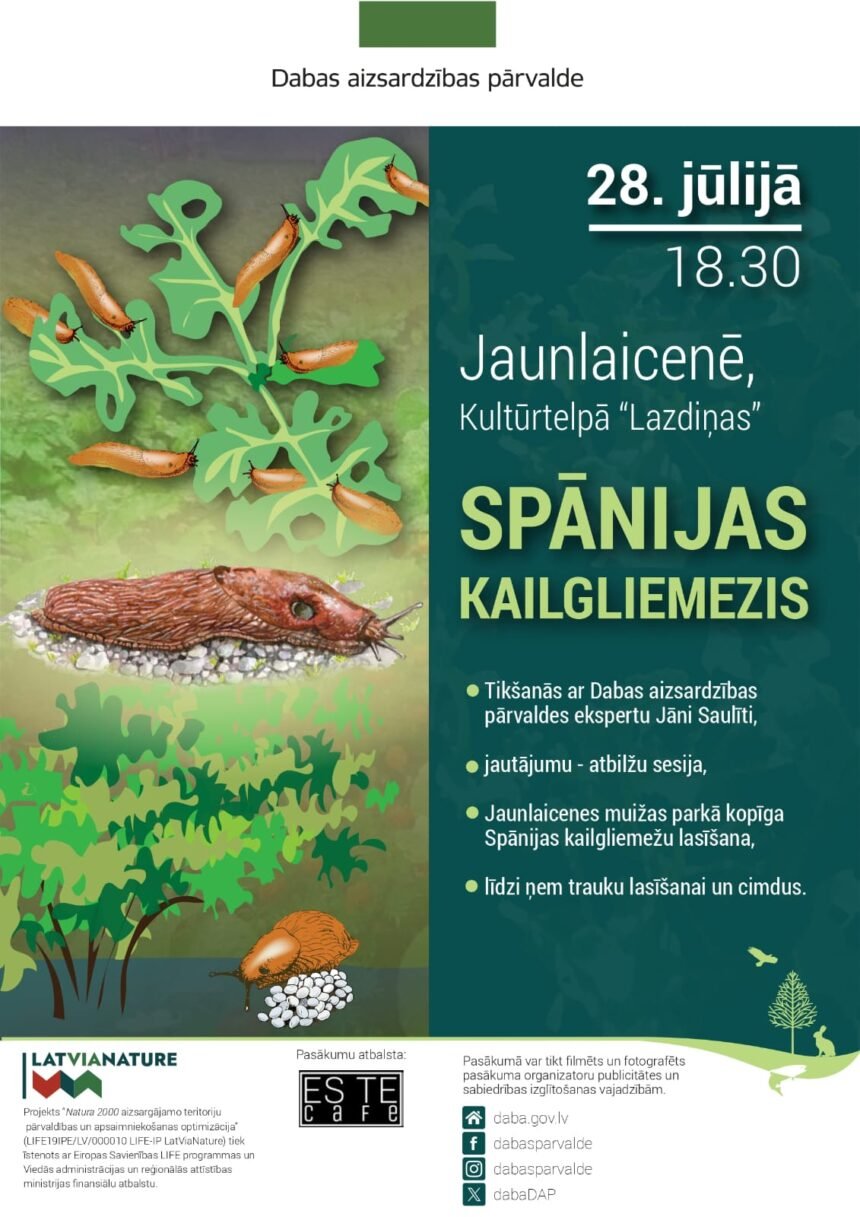 Pēc sarunas Jaunlaicenes muižas parkā visi aicināti uz kopīgu Spānijas kailgliemežu lasīšanu – līdzi lūgums ņemt trauku lasīšanai (ar vāku vai korķi) un cimdus.
