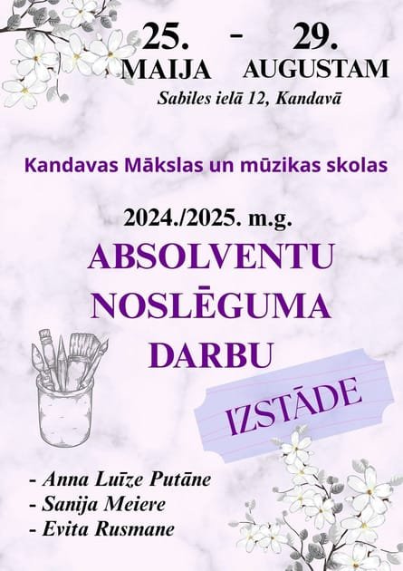 No 25.maija līdz 29.augustam Kandavas Mākslas un mūzikas skolas 2. stāvā ir apskatāma 2024./2025. mācību gada mākslas nodaļas absolventu nobeiguma darbu izstāde!
