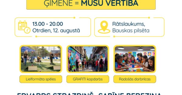 Jaunatnes organizācija “Laiks Jauniešiem”, atzīmējot Starptautisko jaunatnes dienu, aicina ikvienu interesentu – mazu un lielu – otrdien, 12. augustā, no plkst. 13.00 līdz 20.00 svinēt ģimenes dienu, Bauskas pilsētā apmeklējot pasākumu “Kopā radoši, kopā spēcīgi!”