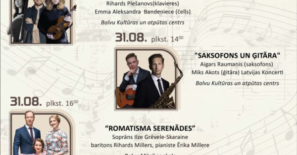 - Plkst. 14.00 Balvu Kultūras un atpūtas centrā klausītājus priecēs duets programmā “Saksofons un ģitāra”. Šo koncertu piedāvā “Latvijas Koncerti”, un tajā uzstāsies saksofonists Aigars Raumanis un ģitārists Miks Akots.