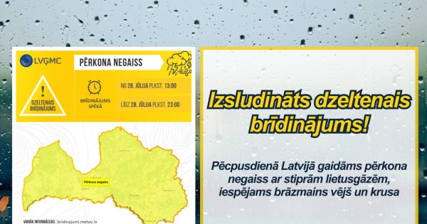 Latvijas Vides, ģeoloģijas un meteoroloģijas centrs (LVĢMC) brīdina, ka 28. jūlija pēcpusdienā plašā Latvijas teritorijā gaidāms pērkona negaiss ar stiprām lietusgāzēm, iespējams brāzmains vējš un krusa, kas turpināsies līdz vakaram. LVĢMC izplatījis visā Latvijā dzelteno brīdinājumu, kas būs spēkā no plkst. 13.00 līdz 23.00.