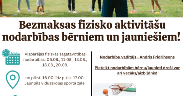 Tukuma novada pašvaldība, sadarbībā ar SIA “OnPlate pasākumi”, aicina piedalīties BEZMAKSAS fizisko aktivitāšu nodarbībās bērniem, jauniešiem un pieaugušajiem, lai uzlabotu fizisko veselību, nostiprinātu muskulatūru, attīstītu līdzsvaru, stāju un izturību. Šīs nodarbības ir lieliska iespēja visiem Tukuma novada iedzīvotājiem uzlabot savu fizisko sagatavotību dažādos līmeņos.