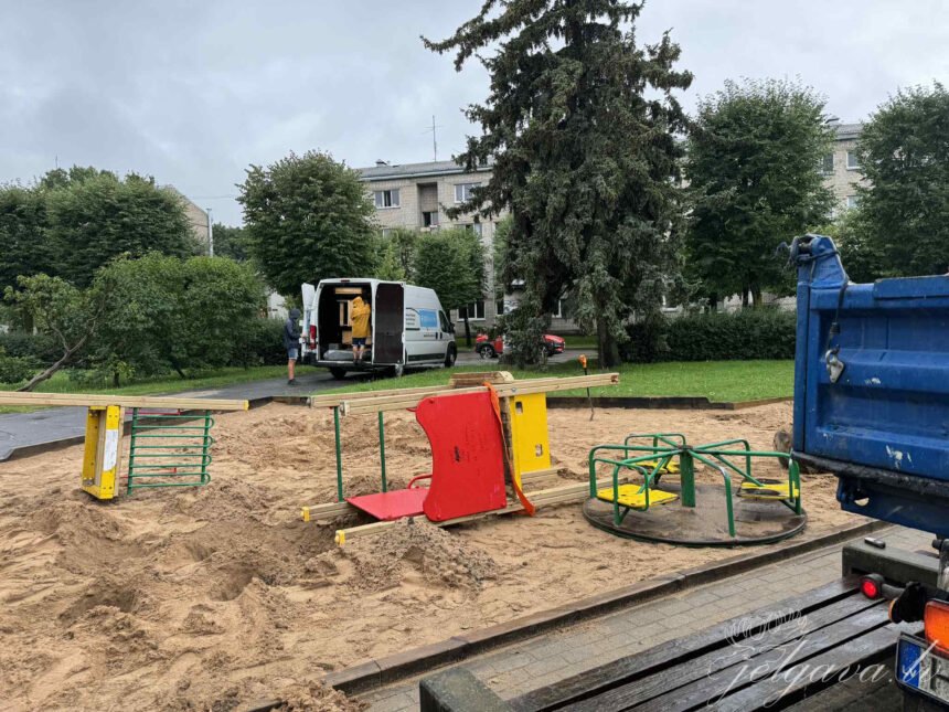 Šobrīd tiek nojaukts līdzšinējais rotaļu komplekss ar slidkalniņu, karuselis un šūpoles.