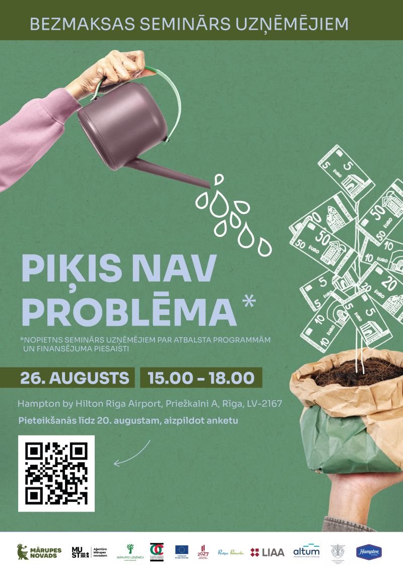 26. augustā no plkst. 15.00 līdz plkst. 18.00 Rīgā, viesnīcā “Hampton by Hilton” (lidostas “Rīga” teritorija, Priežkalni A) norisināsies praktisks seminārs “Piķis nav Problēma” esošajiem un potenciālajiem uzņēmējiem. Semināra tēma – atbalsta piesaistes iespējas saimnieciskajai darbībai ar lauksaimniecību nesaistītās nozarēs ārpus Rīgas un citām valsts pilsētām.