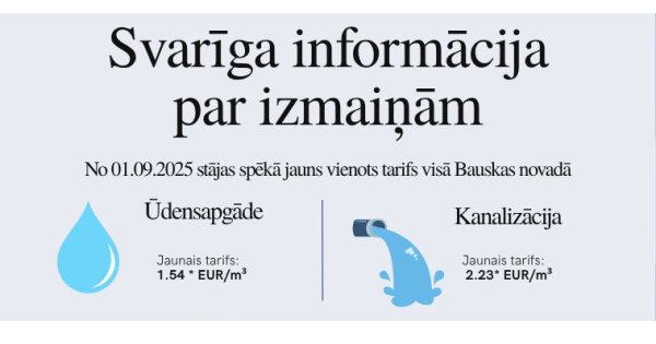 Pašvaldības kapitālsabiedrība SIA ‘’Bauskas novada komunālserviss’’ (BNKS) informē, ka no 2025. gada 1. septembra visā Bauskas novada teritorijā stāsies spēkā vienots ūdenssaimniecības pakalpojumu tarifs. Šis lēmums ir ilga sagatavošanās procesa rezultāts – jau kopš 2024. gada vidus veikts darbs pie tarifu kalkulācijas izstrādes un pakalpojuma izmaksu objektīvas sadales, ņemot vērā uzņēmuma reorganizāciju un pakalpojumu pārvaldības optimizāciju.
