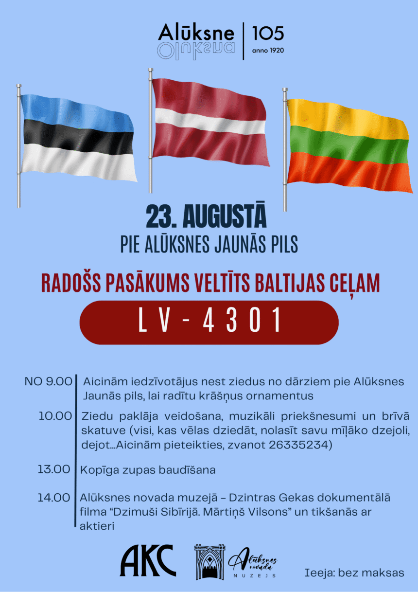 The post Radošs pasākums “LV – 4301” Alūksnē 23. augustā godinās Baltijas ceļa 36. gadadienu appeared first on Alūksnes novads.