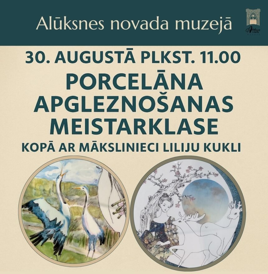 30. augustā plkst. 11.00 Alūksnes novada muzeja vasaras izstāžu zālē “Ledus pagrabs” radoša un iedvesmojoša tikšanās ar mākslinieci Liliju Kukli – iespēja iepazīties ar porcelāna apgleznošanas tehnikām, izmēģināt otas gleznojumu un dekola izmantošanu, kā arī radīt savu unikālu trauka rotājuma dizainu.