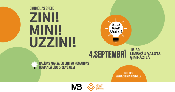 Erudīcijas spēle “Zini! Mini! Uzzini!” atgriežas Limbažos un kļūst par regulāru notikumu. Pēc veiksmīgā pavasara pilotpasākuma, kas norisinājās Limbažu Valsts ģimnāzijā, interaktīvā erudīcijas spēle “Zini! Mini! Uzzini!” atgriežas Limbažos 4.septembrī plkst.18.30, iezīmējot jaunas tradīcijas sākumu. Pasākums vēlreiz notiks Limbažu Valsts ģimnāzijas telpās, un no šī brīža Limbaži kļūs par vienu no spēles pastāvīgajām pieturvietām.