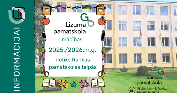 Remonta laikā 2025./2026.m.g. mācības notiks Rankas pamatskolas telpās, adrese: Skolas iela- 5, Rankas pagasts, kur skolēnus un skolotājus sagaidīs silta, draudzīga un darbam gatava vide. Jauna vieta nozīmē arī jaunas iespējas – jaunu iedvesmu un pieredzi!
